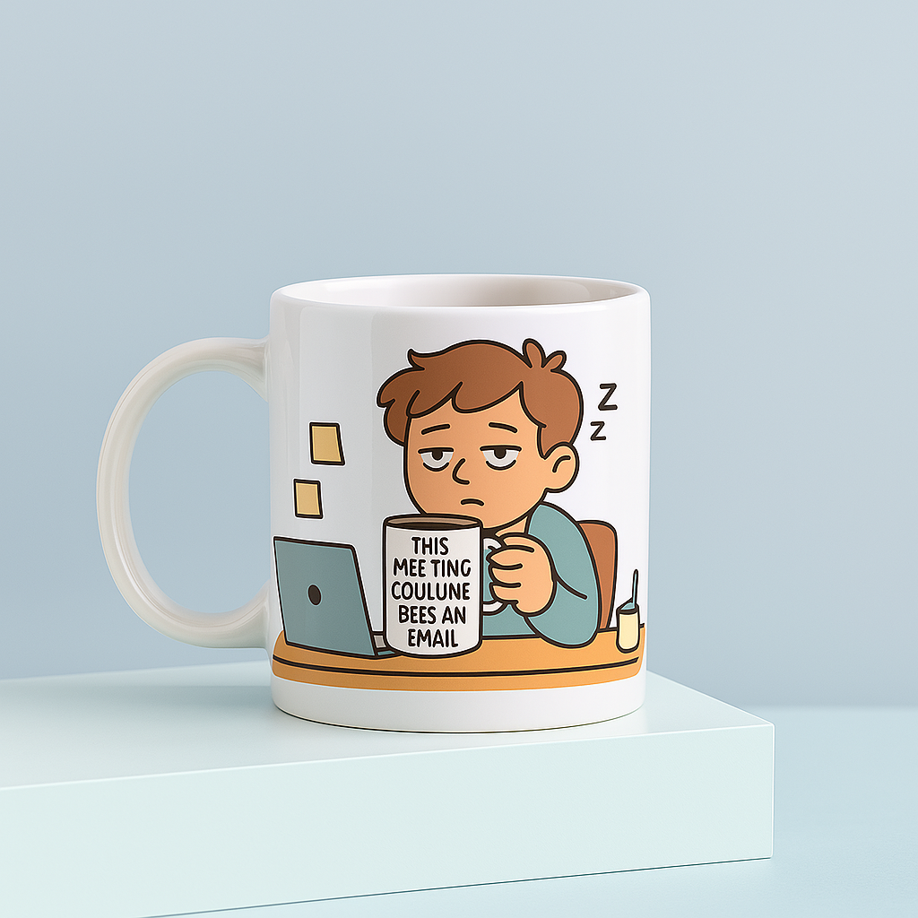 Featuring a tired cartoon office worker clinging to his coffee like his last hope, this ceramic mug is perfect for home, office, or Zoom meetings that drag on forever.